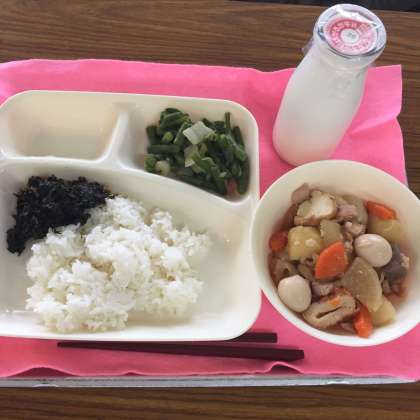 今日の献立は、ご飯、関東煮、三度豆のからしあえ、のりの佃煮でした。