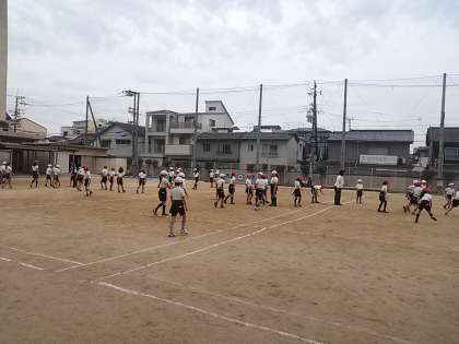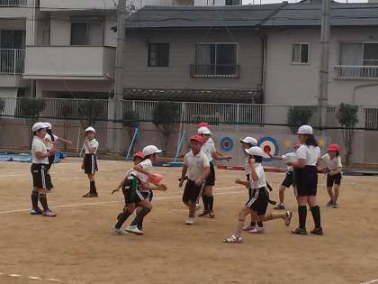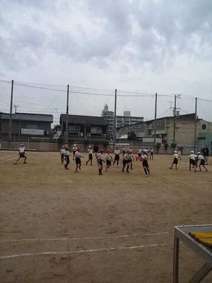 タグラグビーの試合中!(^^)! 3クラスで対抗戦!