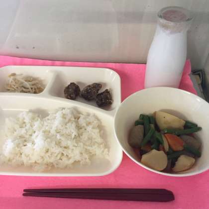 今日は、ご飯、くじらの竜田揚げ、里芋と野菜の煮物、もやしのゆずの香あえでした。