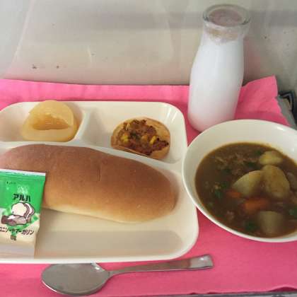 今日は、コッペパン、牛乳、豚肉と大根のカレー煮、変わりピザでした。
