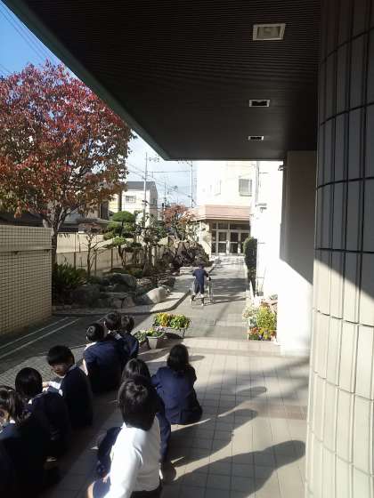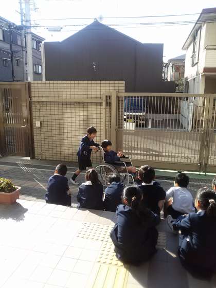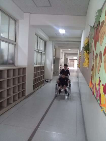 車いす体験をしています。交代で車いすに乗車することにより、乗っている人や押している人がどんな気持ちでいているのかを考えました。