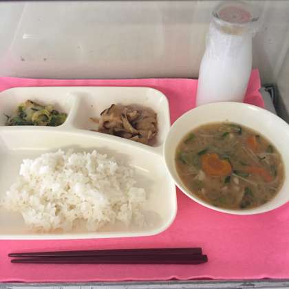 今日の献立は、ご飯、鶏肉の甘辛焼き、さつまいものみそ汁、菊菜と白菜のごまあえでした。