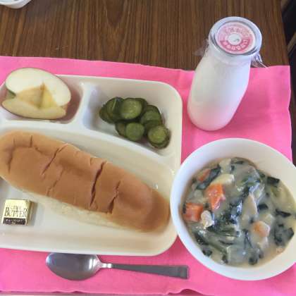 今日は、コッペパン、ほたて貝のクリームシチュー、きゅうりのピクルス、りんごでした。