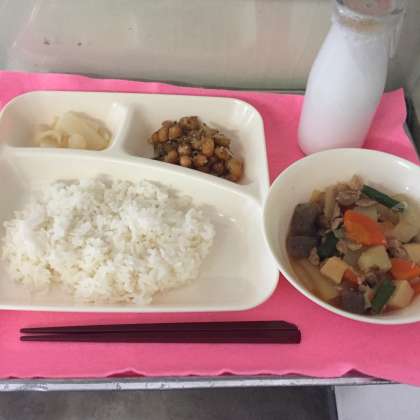 今日は、ご飯、鶏肉と野菜の煮物、じゃこ豆、かぶのゆず風味でした。