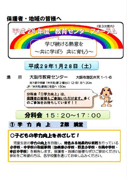 1月28日(土)15:20〜大阪市教育センターにて「教育センターフォーラム」が行われます。内容等詳細は下記のチラシをご覧ください。