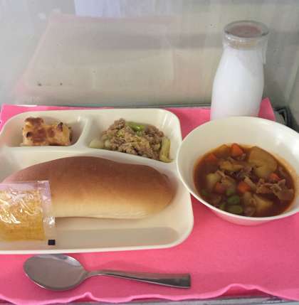 今日の献立は、コッペパン、マーマレード、豚肉と野菜のケチャップ煮、ツナとキャベツのソテー、桃のクラフティでした。