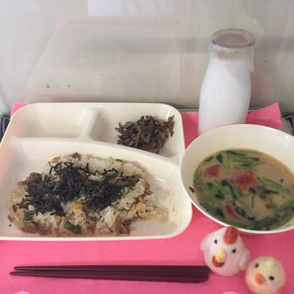 今日は、お正月の行事献立で「きんぴらちらし、ぞう煮、ごまめ」でした。