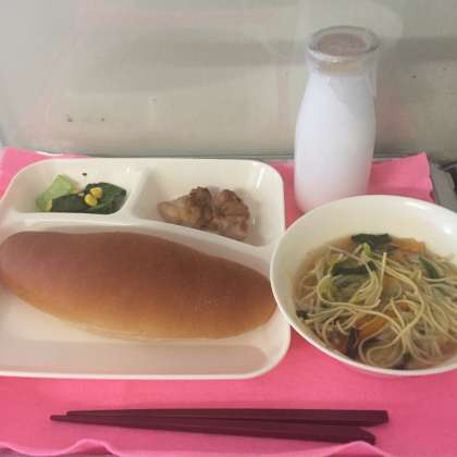 今日は、黒糖パン、鶏肉のオイスターソース焼き、ラーメン、チンゲンサイとコーンの中華あえでした。