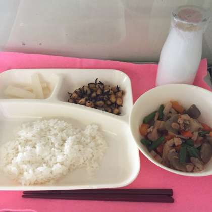 今日は、ご飯、筑前煮、ひじき豆、大根のゆず風味でした。