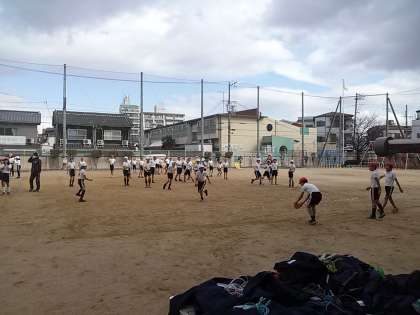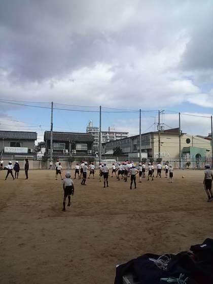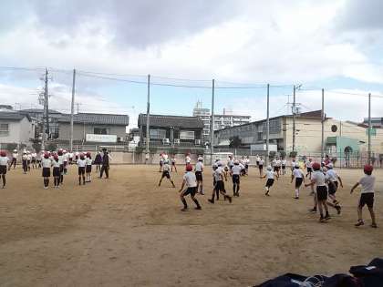 運動場では1組VS3組でドッジボール大会。試合前に円陣を組んだり掛け声を出したりして盛り上がっていました。2組は講堂で縄跳びに取組んでいました。