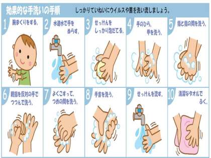 手洗いはあらゆる感染症の予防に有効です。インフルエンザが流行しているときには、外出するたびに手、顔、衣服にウイルスが付着する可能性があります。外出から帰宅後、トイレの後、食事の前には、手洗いを忘れないように習慣化して予防しましょう。(大阪市HPより)