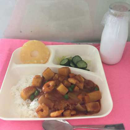 今日は、シーフードカレーライス、グリーンサラダ、パインアップル缶でした。