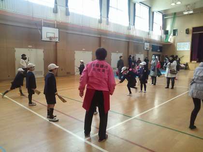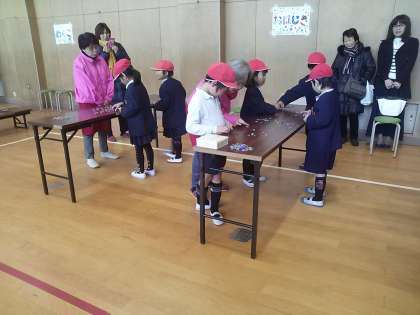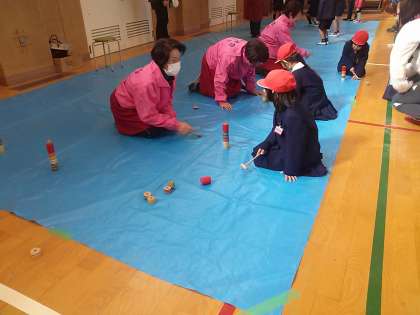 めんこ・羽子板・おじゃみ・けん玉・コマ回し・ダルマおとし等たくさんの遊びを体験しました。普段経験することが少ない伝統的な昔遊びに子どもたちは大はしゃぎでした。地域の皆様方、ご指導ありがとうございました。