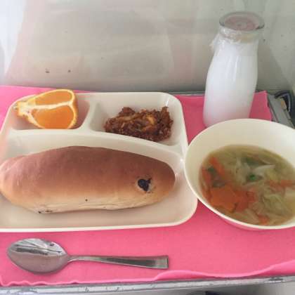 今日は、レーズンパン、豆腐のミートグラタン、麦と野菜のスープ、デコポンでした。