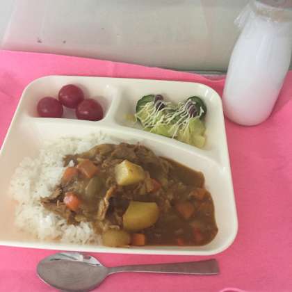 今日は、ポークカレーライス、金時豆と野菜のサラダ、プチトマトでした。
