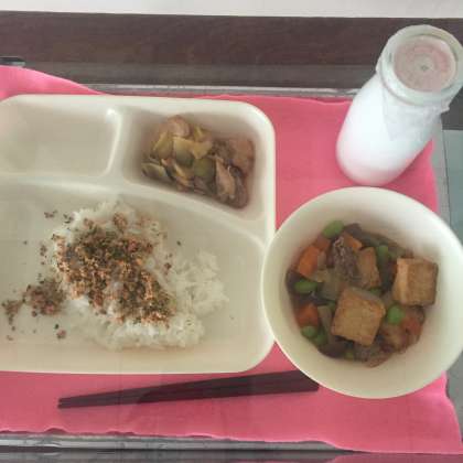 今日の献立は、ご飯、焼きとり、厚揚げと豚肉の煮物、紅ざけそぼろでした。