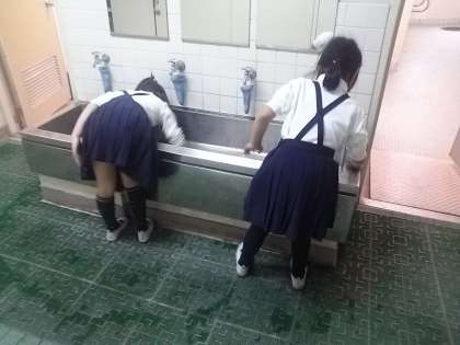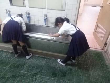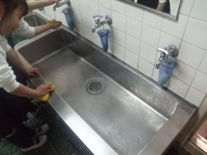 今日から清掃が始まりました。職員室前トイレの手洗い場の担当は2年生。協力してそうじを頑張ってくれていました。