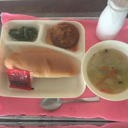 今日は、コッペパン、いちごジャム、煮込みハンバーグ、コーンスープ、三度豆のサラダでした。