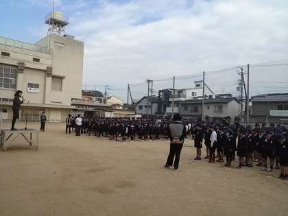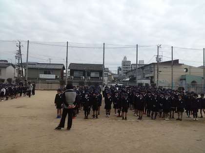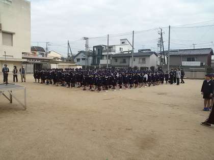 今年度はじめての児童朝会です。まずは、整列指導。学年が一つ上がったので並ぶ位置もかわります。