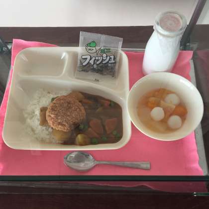 今日は、カツカレーライス、フルーツ白玉、ミニフィッシュでした。