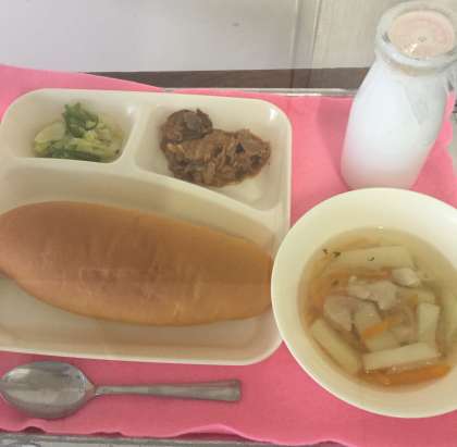 今日はパンプキンパン、豚肉のデミグラスソース、スープ、キャベツとピーマンのソテーでした。