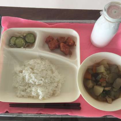 今日は、ご飯、まぐろのオーロラ煮、じゃがいもと野菜の含め煮、きゅうりともやしのゆずの香あえでした。
