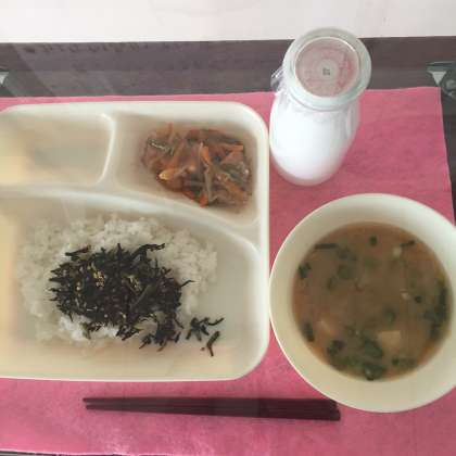 今日は、ご飯、さけの野菜たっぷりあんかけ、みそ汁、まぜまぜふりかけでした。