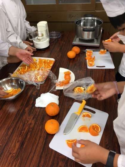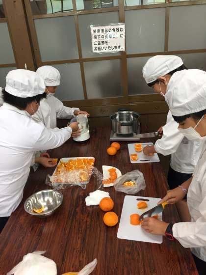 まずは原料となる和歌山県産オレンジをカットします