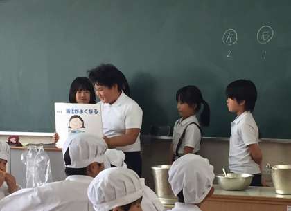給食委員会のメンバーが各教室をまわり、紙芝居を読んで噛むことの大切さを知ってもらう取り組みです。