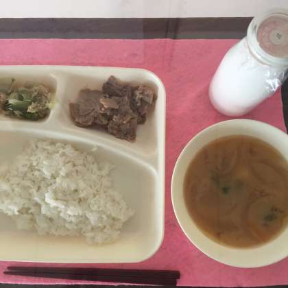 今日は、ご飯、豚肉のおろしじょうゆかけ、みそ汁、野菜いためでした。