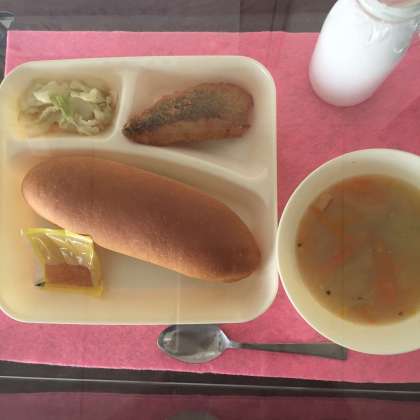 今日は、コッペパン、サーモンフライ、コーンスープ、キャベツのソテーでした。