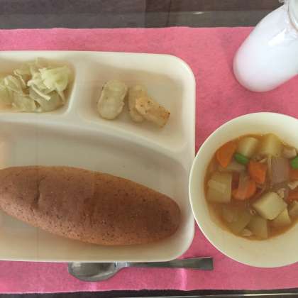 今日は、ライ麦パン、いか天ぷら、フレッシュトマトのスープ煮、キャベツのピクルスでした。