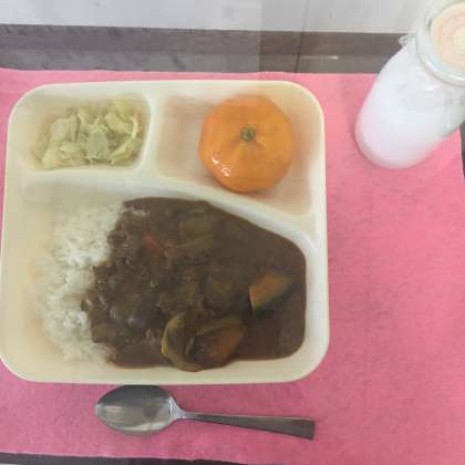 今日の献立は、夏野菜のカレーライス、キャベツのサラダ、冷凍みかんでした。