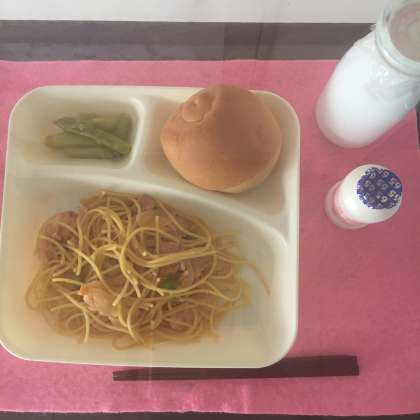 今日は、黒糖パン、シーフードトマトスパゲッティ、グリーンアスパラガスのサラダ、はっこう乳でした。