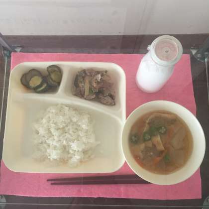 今日の献立は、ご飯、豚肉とピーマンのしょうが焼き、とうがんのみそ汁、きゅうりのピリ辛あえでした。