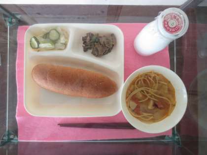 今日の献立は、ライ麦パン、牛肉のカレー風味焼き、トマトのスープスパゲッティ、キャベツときゅうりのピクルスでした。