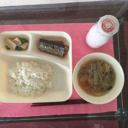 今日の献立は、ご飯、さんまのさんしょう焼き、すまし汁、高野豆腐の煮物でした。