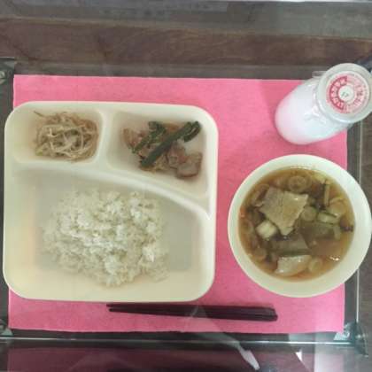 今日の献立は、ご飯、鶏肉のごまだれ焼き、ソーキ汁、もやしのしょうがじょうゆあえでした。