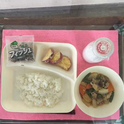 今日の献立は、ご飯、豚肉と一口がんもの煮物、さつまいもの天ぷら、ミニフィッシュでした。