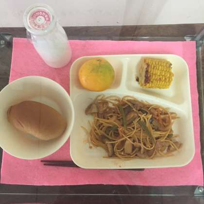 今日の献立は、黒糖パン、きのこのスパゲッティ、焼きとうもろこし、みかんでした。