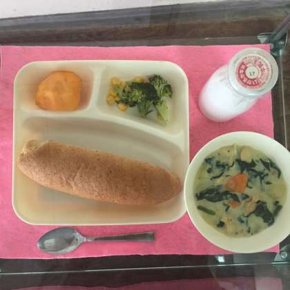 帆立貝のクリームシチューは、帆立貝柱の他に旬のほうれん草を使用しています。帆立貝と鶏肉の旨みで、野菜も美味しくなります。どのクラスもよく食べていました。