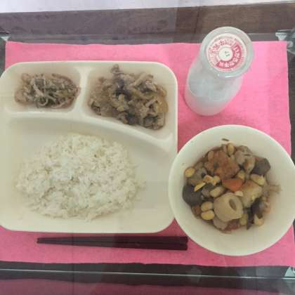 今日の献立は、ご飯、豚肉のごまだれ焼き、大豆の煮もの、切り干し大根のしそ甘酢づけでした。