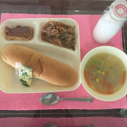 今日の献立は、コッペパン、ソフトマーガリン、豚肉のケチャップソテー、コーンスープ、焼きプリンでした。