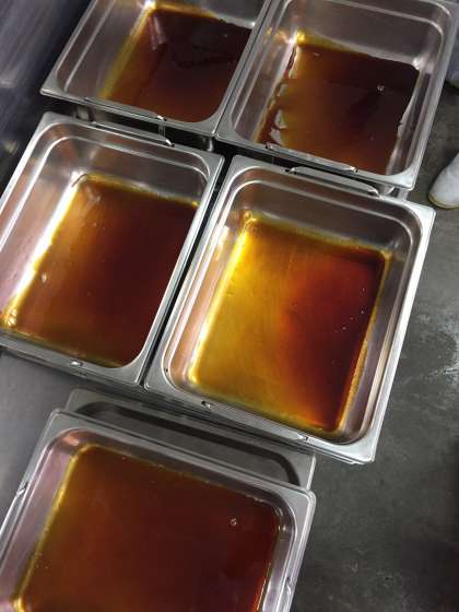 手作りデザートの焼きプリンは、砂糖を焦がしてカラメルソースを作り、卵、牛乳、砂糖、生クリームで作ったプリン液を流し入れて、オーブンで焼き上げます。給食のプリンは、一クラス分ずつバットに入れて作っています。