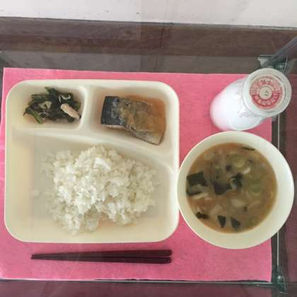 今日の献立は、ご飯、さばのみぞれかけ、みそ汁、小松菜の炒めものでした。