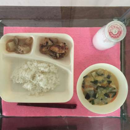今日の献立は、ご飯、鶏肉の甘辛焼き、みそ汁、大根の煮物でした。