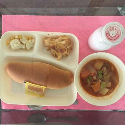 今日の献立は、コッペパン、アプリコットジャム、鶏肉と野菜のケチャップ煮、カリフラワーとコーンのサラダ、桃のクラフティでした。