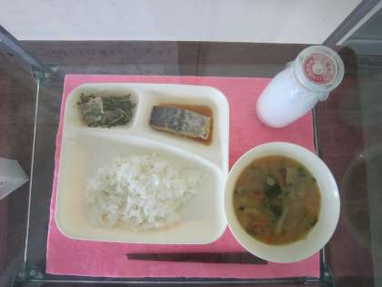 今日の献立は、ご飯、さごしのしょうゆだれかけ、みそ汁、水菜の煮びたしでした。