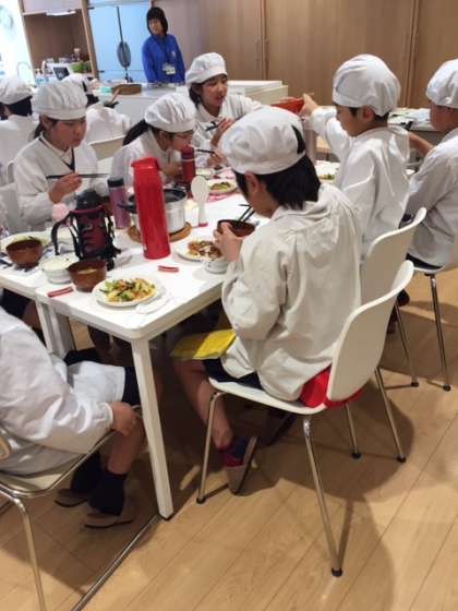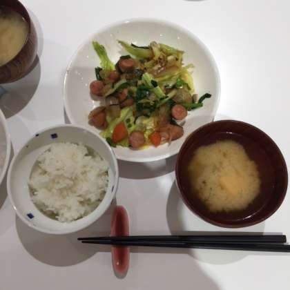 できあがった昼食です。メニューは、ご飯、野菜いため、みそ汁、かつおぶしのふりかけでした。
