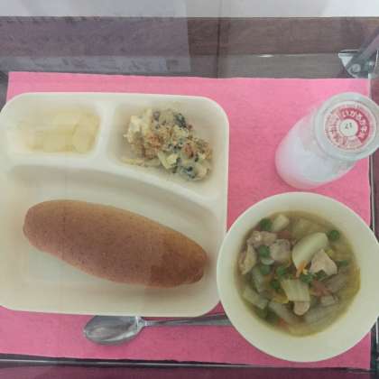今日の献立は、ライ麦パン、帆立貝のグラタン、スープ、和梨(缶)でした。